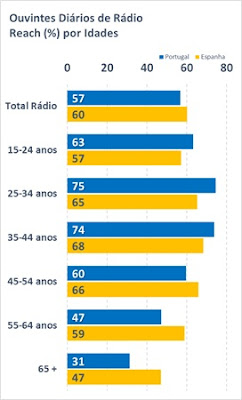 Para ambos os países, a penetração nos escalões mais jovens enquadra-se no intervalo entre 57% e 63%. Já nos dois grupos seguintes, abrangendo dos 25 aos 44 anos, o nível de audiência de rádio é claramente superior em Portugal, sendo escutada diariamente por 3 quartos dos portugueses dessas idades, enquanto em Espanha é escutada por dois terços. A partir dos 55 anos, a tendência inverte-se. Comparativamente, há mais ouvintes espanhóis de rádio nos escalões etários superiores, com o pico de diferença no segmento mais idoso, onde a penetração da rádio espanhola é superior em 16 pontos percentuais.
