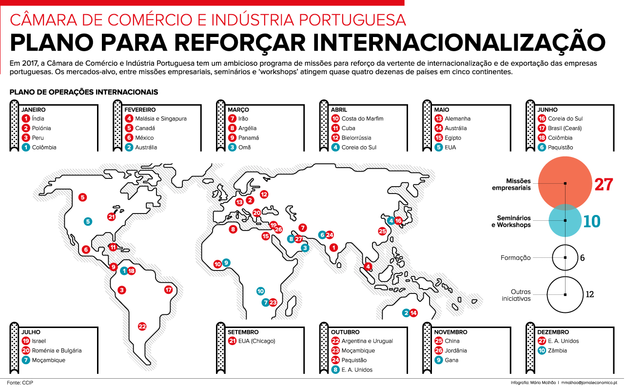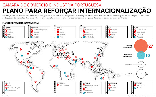 Em 2017, a Câmara de Comércio e Indústria Portuguesa tem um ambicioso programa de missões para reforço da vertente de internacionalização e de exportação das empresas portuguesas. Os mercados-alvo, entre missões empresariais, seminários e ‘workshops’ atingem quase quatro dezenas de países em cinco continentes (Jornal Económico)